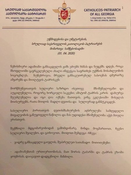 „ნებისმიერი ადამიანი განსაცდელის ჟამს ეძიებს ხსნას და ნუგეშს. დღეს, როცა მსოფლიოში გავრცელებული ახალი ინფექცია საფრთხეს უქმნის მოსახლეობის სიცოცხლეს, ბუნებრივია, მრევლი განსაკუთრებულ სასოებას ღმერთზე ამყარებს და მიილტვის ტაძრისკენ;