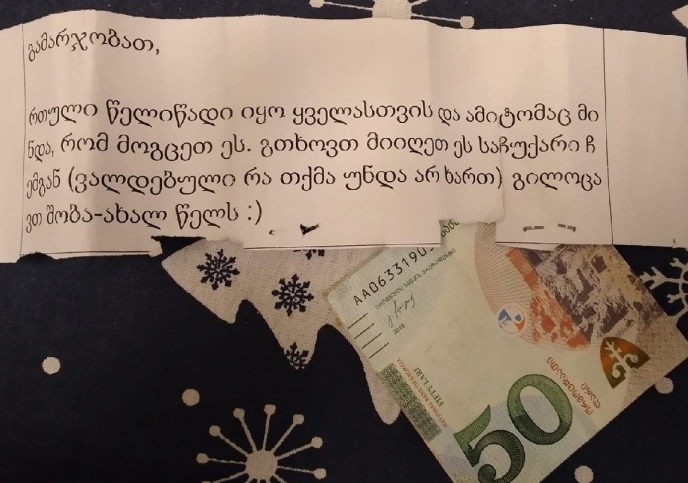 ეს პატარა საახალწლო ამბავი თბილისში მოხდა – 31 დეკემბერს სამების ტაძარში მოსალოცად ასულ ადამიანებს უცხო პირმა, რომელიც ანონიმად დარჩა, ასეთ ფურცელში გახვეული 50-ლარიანი ბანკნოტები ჩამოურიგა და დატოვა ტაძარი.