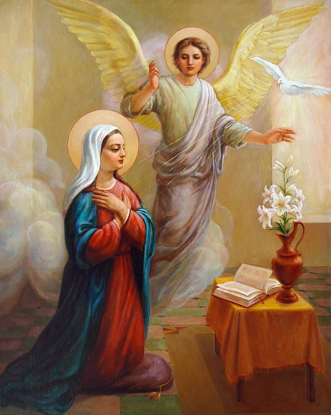 წმინდა წერილის თანახმად, გაბრიელ მთავარანგელოზი ქალწულ მარიამს გამოეცხადა და ახარა, რომ ის ძეს ღვთისას შობდა და ამით ის ძე კაცისა გახდებოდა. მარიამმა ანგელოს მიუო: „აჰა მხევალი ვარ უფლისა, მეყოს შენი სიტყვისამებრ“.