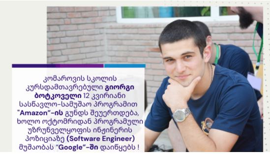 “კომაროვის სკოლის კურსდამთავრებული, გიორგი ბოტკოველი (2018 წლის გამოშვება) 2022 წლის აპრილიდან “Amazon”-ის გუნდს შეუერთდება, ხოლო ოქტომრიდან პროგრამული უზრუნველყოფის ინჟინერის პოზიციაზე (Software Engineer) მუშაობას “Google”-ში დაიწყებს!