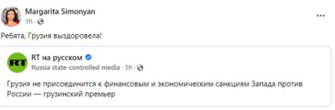 „მეგობრებო, საქართველო გამოჯანმრთელდა!“ – პუტინის ერთ-ერთი მთავარი პროპაგანდისტი, მარგარიტა სიმონიანი პუტინის რეჟიმის მიერ კონტროლირებული მედია ღარიბაშვილის კომენტარს ავრცელებს, სადაც ამბობს, რომ აქართველო არ აპირებს, მონაწილეობა მიიღოს ფინანსურ და ეკონომიკურ სანქციებში