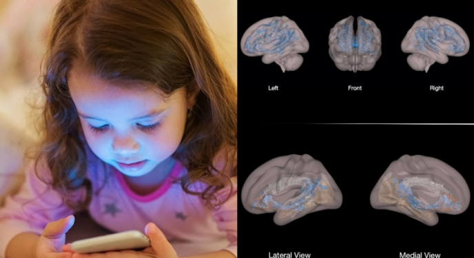 ტომოგრაფიის ჩატარებამდე, ბავშვებს მისცეს კოგნიტური ტესტები, მშობლებმა კი შეავსეს ამერიკის პედიატრების აკადემიის (AAP) მიერ შემუშავებული ტესტი, რომელიც ზომავს ეკრანთან გატარებულ დროს. სკანირების შედეგად აღმოჩნდა, რომ იმ ბავშვებს, რომლებიც ეკრანთან რეკომენდირებულ 1 საათზე მეტს ატარებენ, ტვინის თეთრი ნივთიერება ნაკლებად აქვთ განვითარებული (სურათზე ჩანს ლურჯი ფერით). ტვინის ეს ნაწილი პასუხისმგებელია მეტყველებისა და კოგნიტური უნარების განვითარებაზე. ნაცრისფერი ნივთიერება შეიცავს