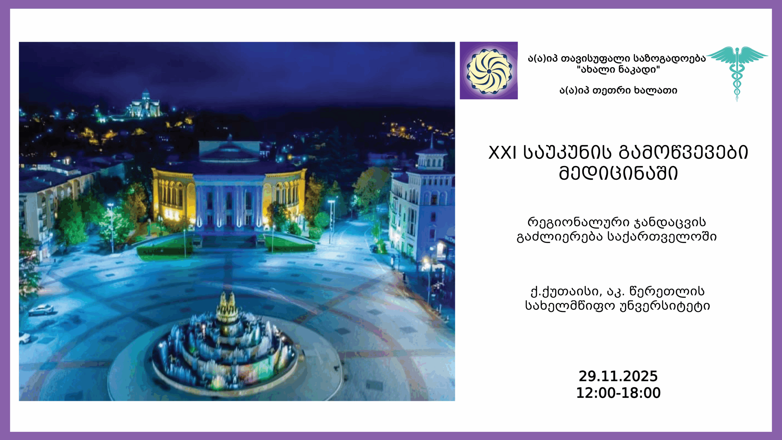 2025 წლის 29 ნოემბერს, ქუთაისში გაიმართება მასშტაბური სამედიცინო კონფერენცია თემით: „XXI საუკუნის გამოწვევები მედიცინაში“. ღონისძიებას ორგანიზებას უწევს ა(ა)იპ თავისუფალი საზოგადოება – ახალი ნაკადის ჯანდაცვის ფოკუს ჯგუფი და ა(ა)იპ „თეთრი ხალათი“, ქუთაისის მუნიციპალიტეტის შუამდგომლობითა და აკაკი წერეთლის სახელმწიფო უნივერსიტეტის მასპინძლობით.