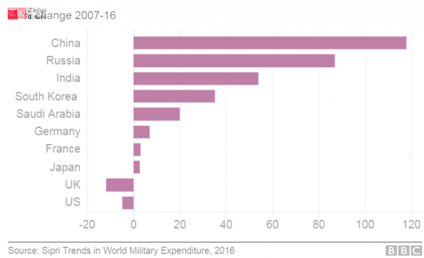 BBC -ის მონაცემებით, 2007 წლიდან 2016 წლამდე შეიარაღებული ძალების შემცირება მხოლოდ შეერთებულმა შტატებსა და დიდ ბრიტანეთში მოხდა. თითქმის თანაბრადაა გაზრდილი საფრანგეთსა და იაპონიაში. ყველაზე დიდი რაოდენობით ზრდა შეინიშნება ჩინეთში, რუსეთსა და ინდოეთში.