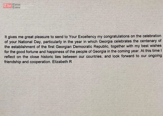 მისი უდიდებულესობა დედოფალი ელისაბედ მეორე საქართველოს პრეზიდენტს და საქართველოს მოსახლეობას დამოუკიდებლობის დღეს ულოცავს, ამის შესახებ ბრიტანეთის საელჩოს Facebook-ის გვერდზე გამოქვეყნებულ წერილში წერია.